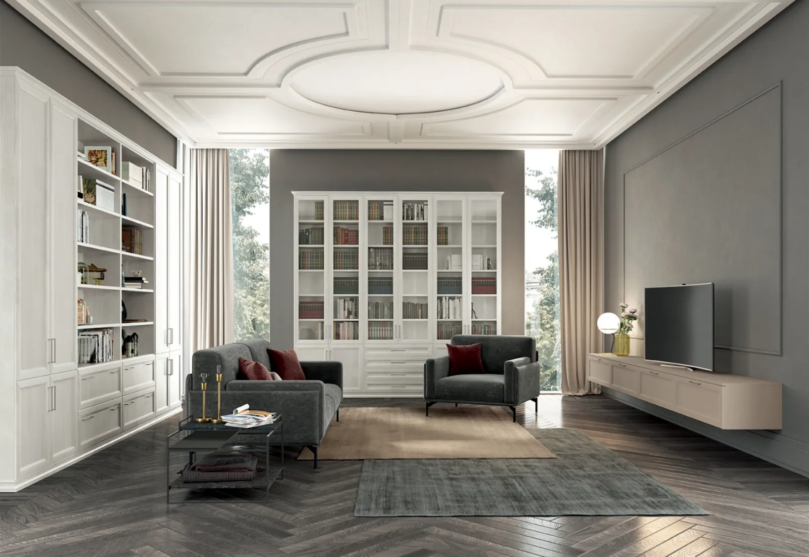 Finiture di pregio e linee decise: scopri la libreria Arcadia AS006 di Colombini Casa tra le più esclusive Librerie classiche a muro.
