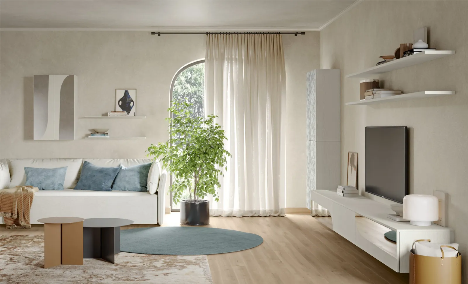 Le Pareti Attrezzate moderne permettono di ricreare diverse atmosfere nel living, liberando spazio e ottimizzando ogni angolo. Scopri la nostra serie di mobili per la zona giorno della firma Colombini Casa e potrai arredare i tuoi interni con uno stile unico e la contenitività di cui hai necessità. La Parete Attrezzata Eclettica EG004 di Colombini Casa diventa presenza caratterizzante in stanze di ogni genere grazie ai suoi accessori modulari e alla possibilità di abbinare finiture, materiali, tonalità, conformazioni e molto altro.