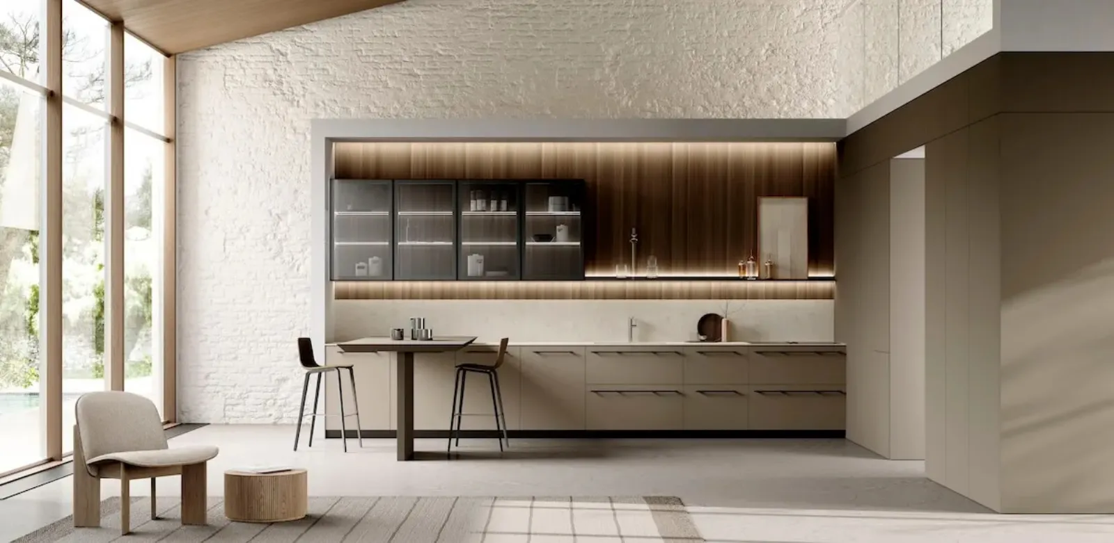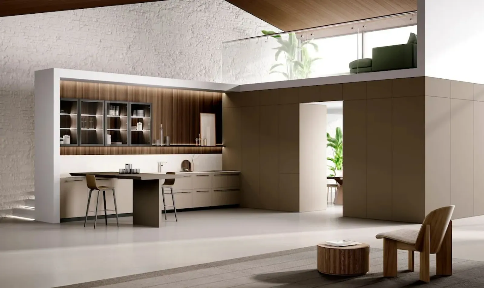 Clicca e scopri un universo di Cucine Moderne con penisola: la cucina Modula Composizione 05 Febal Casa in laccato opaco ti sta aspettando!
