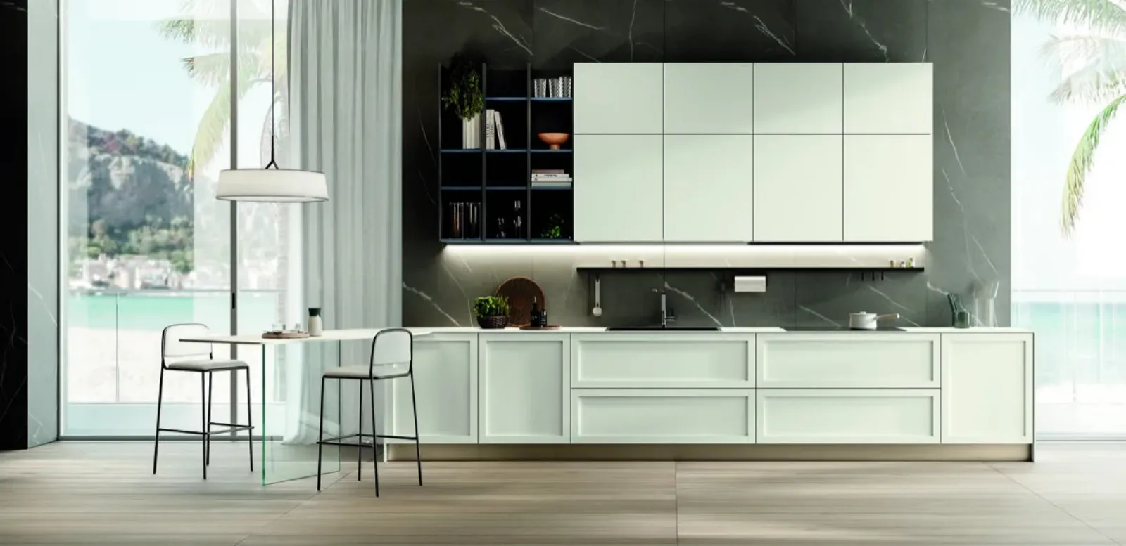 Se sei interessato alle composizioni moderne e non dici di no alla qualità assicurata dal noto e rinomato brand, allora il nostro showroom è il posto giusto. Il modello in Pet nell'immagine, si può declinare in molteplici assetti, tonalità e finiture di grande valore estetico per lasciarti organizzare gli spazi con razionalità, garantendoti la praticità e contenitività di cui necessiti. Scegli la cucina che fa al caso tuo tra le varie soluzioni con penisola disponibili sul mercato: potrai arredare gli spazi impreziosendoli.